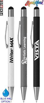 Soft touch, white metal ballpoint and stylus pen with 6 stylus colors. Price includes one full color imprint.